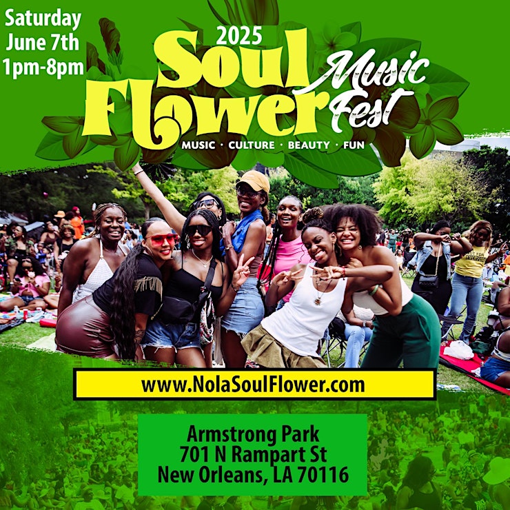 Welcome to the Nola Soul Flower Music Fest. This is one of the most beautiful events of the year taking place at a very special park. On June 7th join over 2500 other beautiful people and Treat your soul to an unforgettable experience. The Soul Flower Music Fest is a one-day music Festival featuring National and Local Soul, R&B, Neo Soul and Hip-Hop Artists. In addition to great music, there will be food, games, shopping, contests and great vibes. Get your tickets today before they are gone